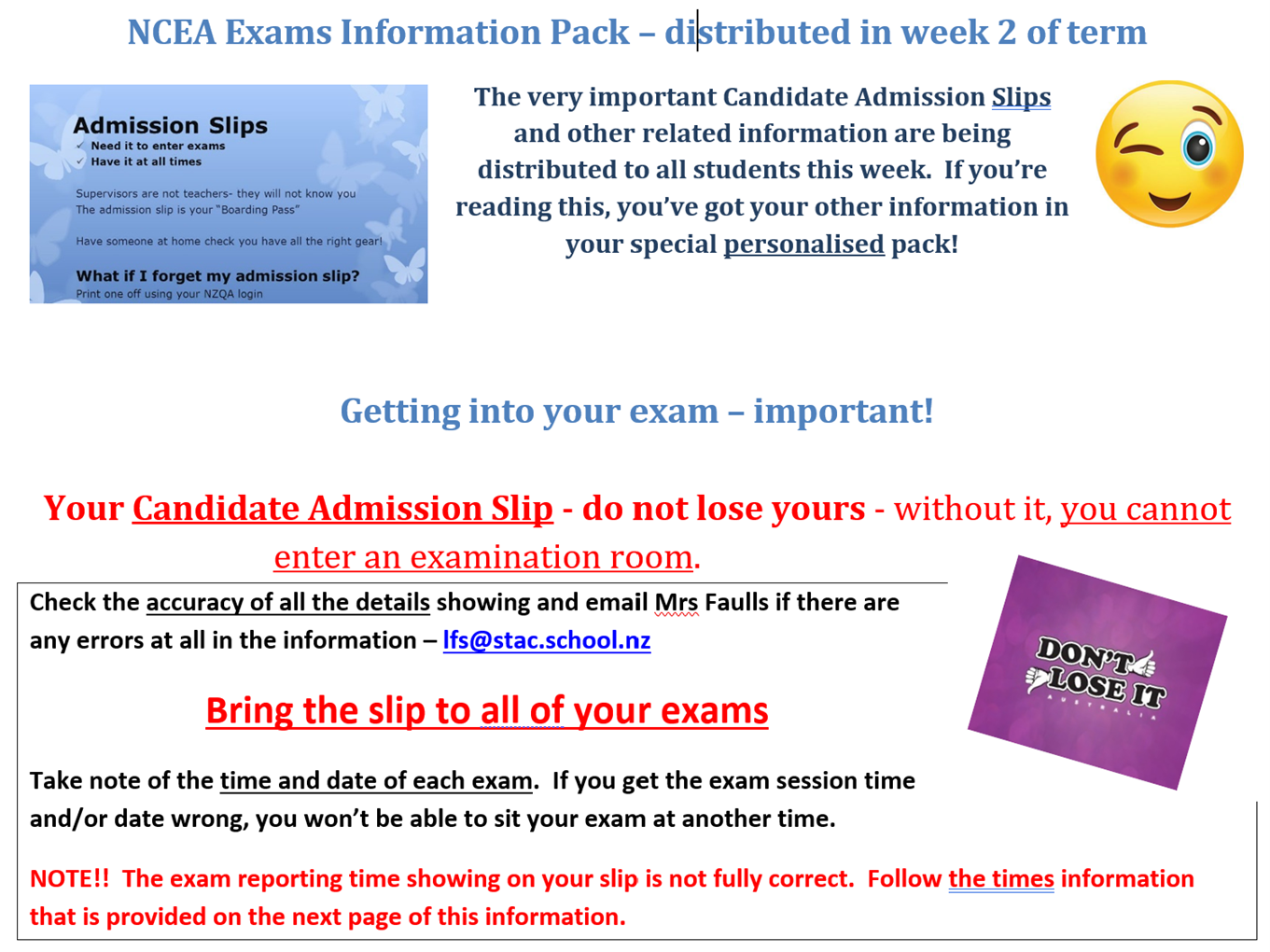 It’s important that parents know what I am telling students in their NCEA newsletter about this pack and, in particular, the Candidate Admission Slip.