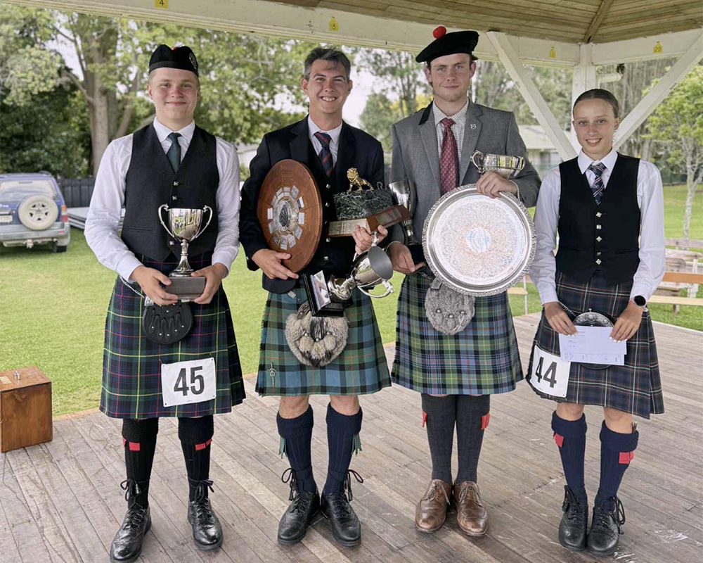 On New Year’s Eve, Pipe Band members Sam Foote (then Year 12), Finlay Trewinnard (then Year 10), Alice Glover (then Year 9), Thomas Bottomley (then Year 8), Patrick Glover (then Year 7) and Pipe Tutor Piers Dover travelled to Northland to compete at the Waipu Highland Games — a key solo piping event featuring New Zealand Championship titles.