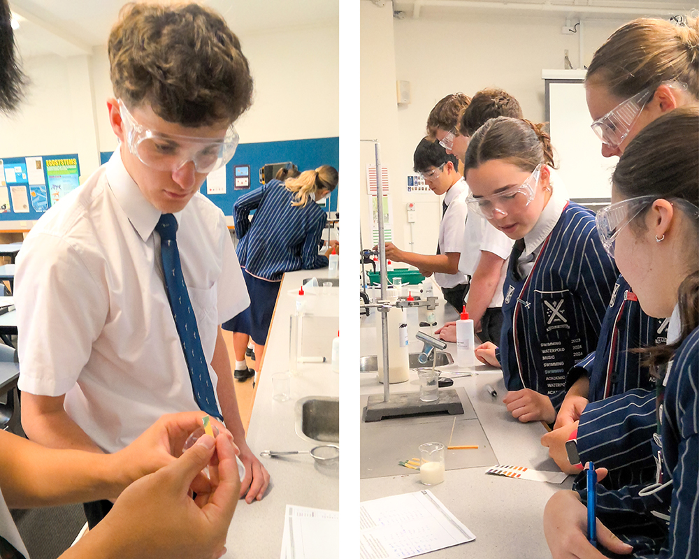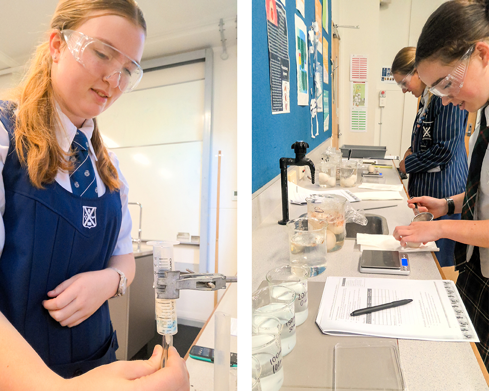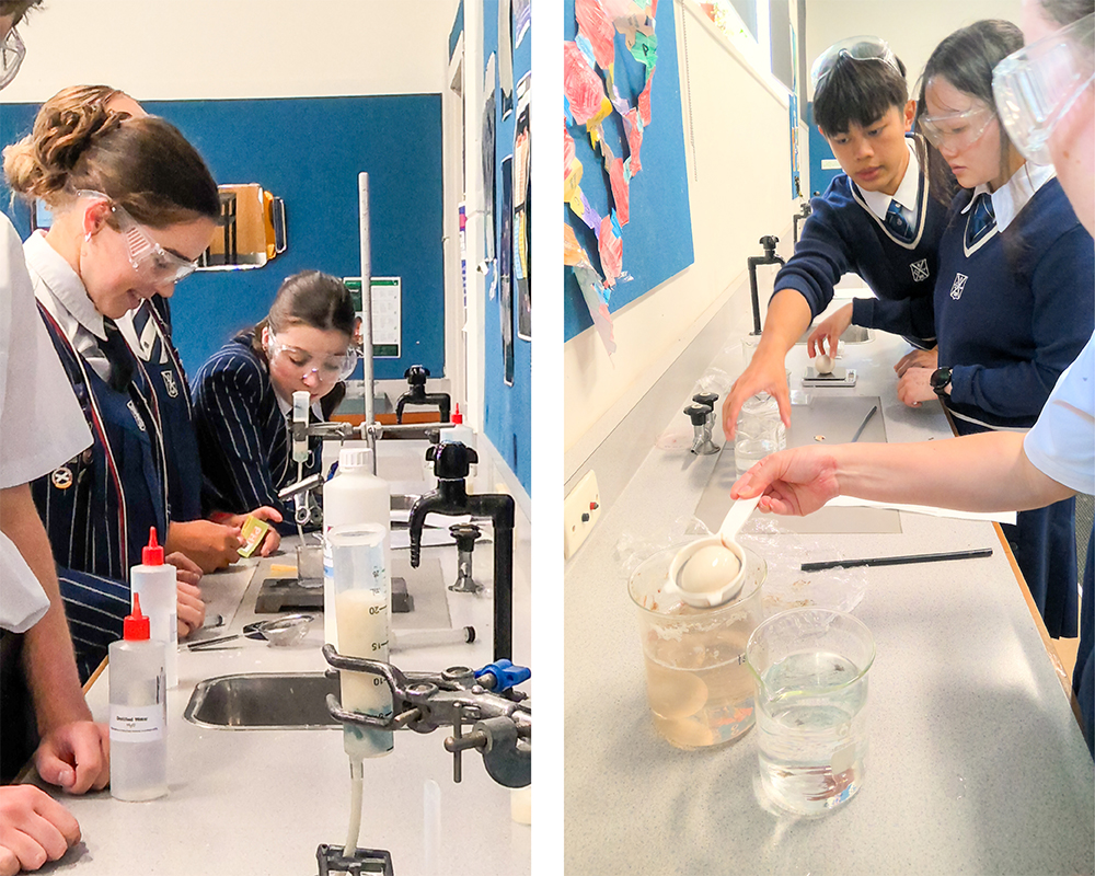 The Year 13 Biology Extension and Enrichment course is an advanced academic opportunity for students who demonstrate strong skills in Biology and are considering a science-based tertiary pathway. The course complements and extends the NCEA Level 3 Biology curriculum by introducing selected content from the internationally recognised Cambridge International Biology syllabus, providing added depth, challenge, and preparation for university-level study. This week, students carried out two experiments. The first investigated the commercial uses of immobilised enzymes. The students made immobilised enzymes containing lipase and used them to process milk. As the lipase broke down milk fats into fatty acids and glycerol, the milk became more acidic, which was shown by changes in pH. The second experiment investigated how cell membranes control the movement of molecules, using chicken eggs as a model. The eggshells were removed by dissolving the calcium carbonate shell in acid, leaving a semi permeable membrane. The eggs were then placed in salt solutions of different concentrations and weighed before and after. Changes in mass showed how water moved in or out of the egg by osmosis, causing the eggs to swell or shrink depending on the solution.